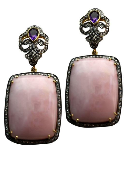 SILVER RHODIUM PINK OPAL / DIAMOND / AMETHYST EARRINGS