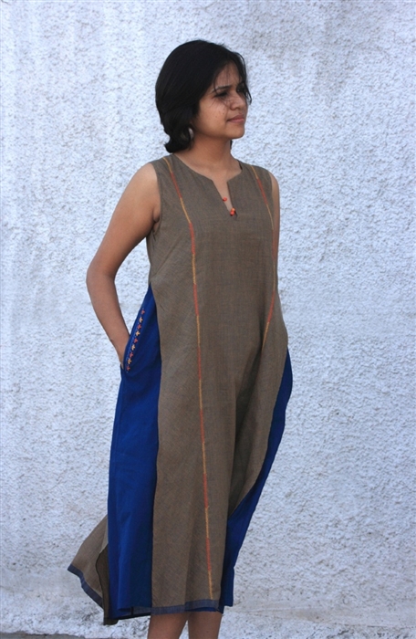 CHECK KHADI COTTON NATURAL DYE DOUBLE LAYERED DRESS WITH EMBROIDERY