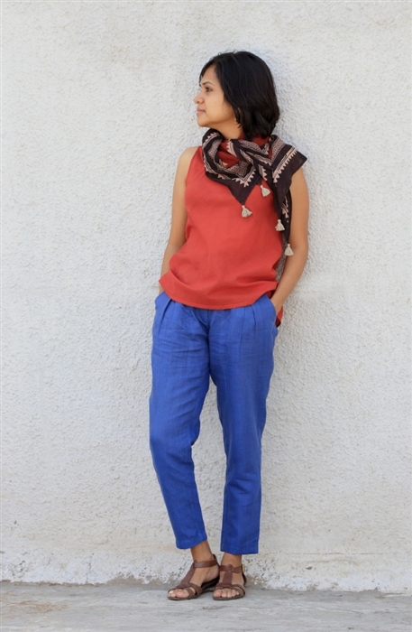 PLAIN COTTON KHADI PLEATED LIM PANTS, MATCHING AJRAK PRINT SCARF WITH TASSEL