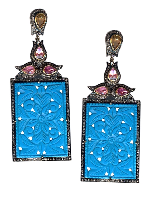 SILVER GOLD PLATED ENGRAVED TURQUOISE / DIAMOND / CITRINE / TOURMALINE EARRRINGS