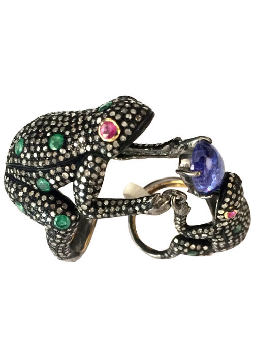 SILVER RHODIUM FROG RING WITH DIAMOND / EMERALD / TANZANITE